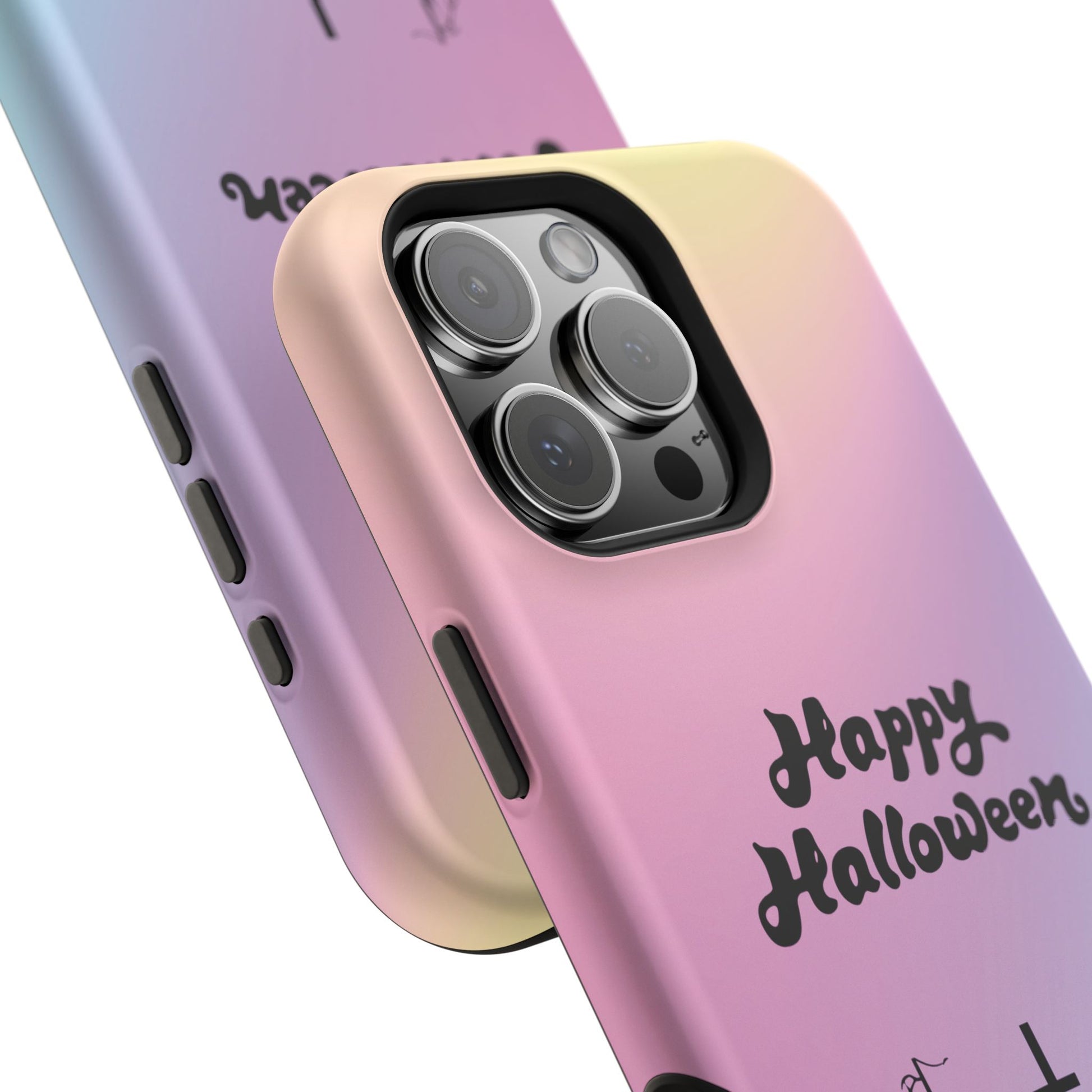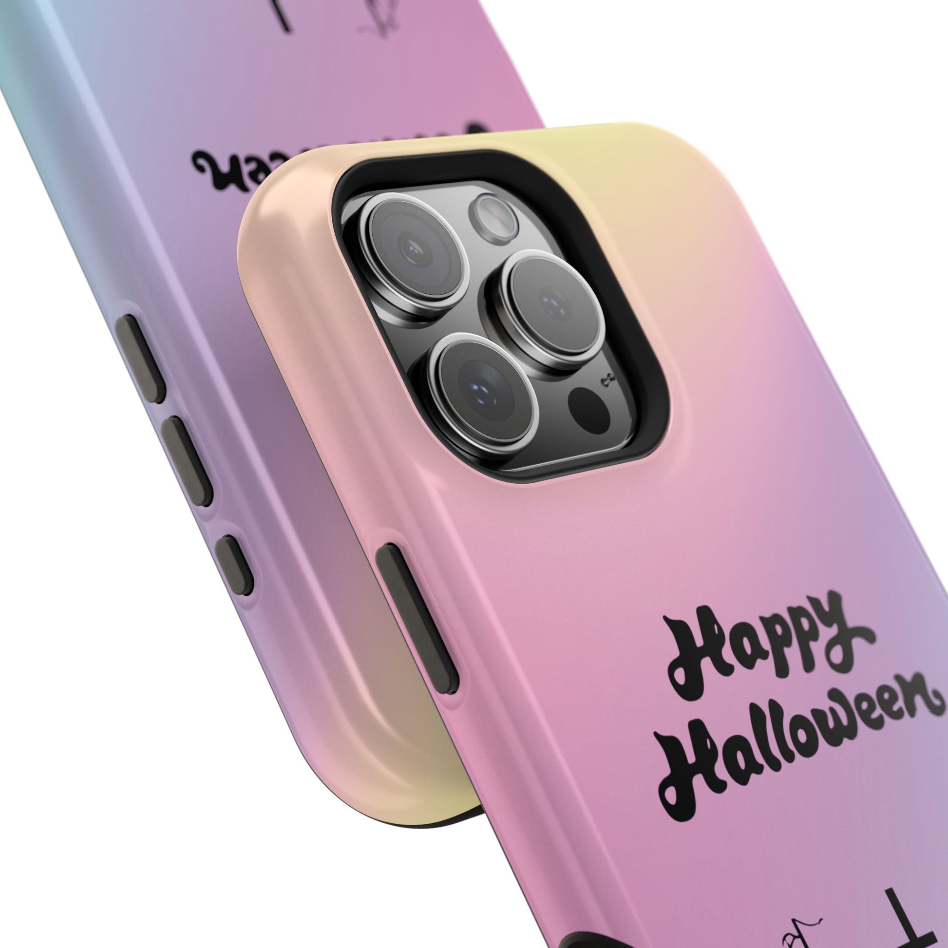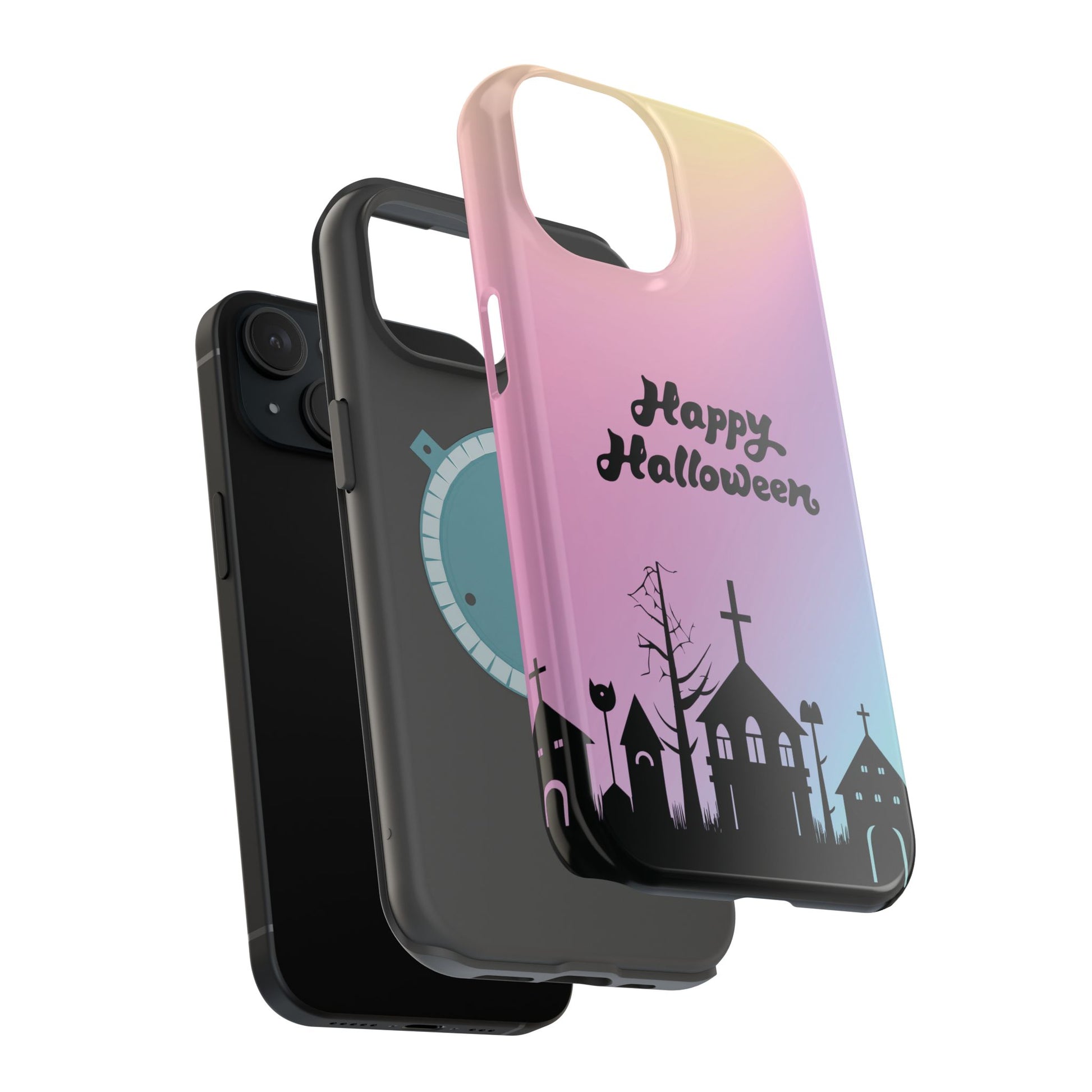 A vibrant and durable phone case featuring a gradient background with a happy Halloween theme and cemeteries. Perfect for Halloween enthusiasts or those who enjoy spooky designs. Ideal for adding a festive touch to your phone during the Halloween season.