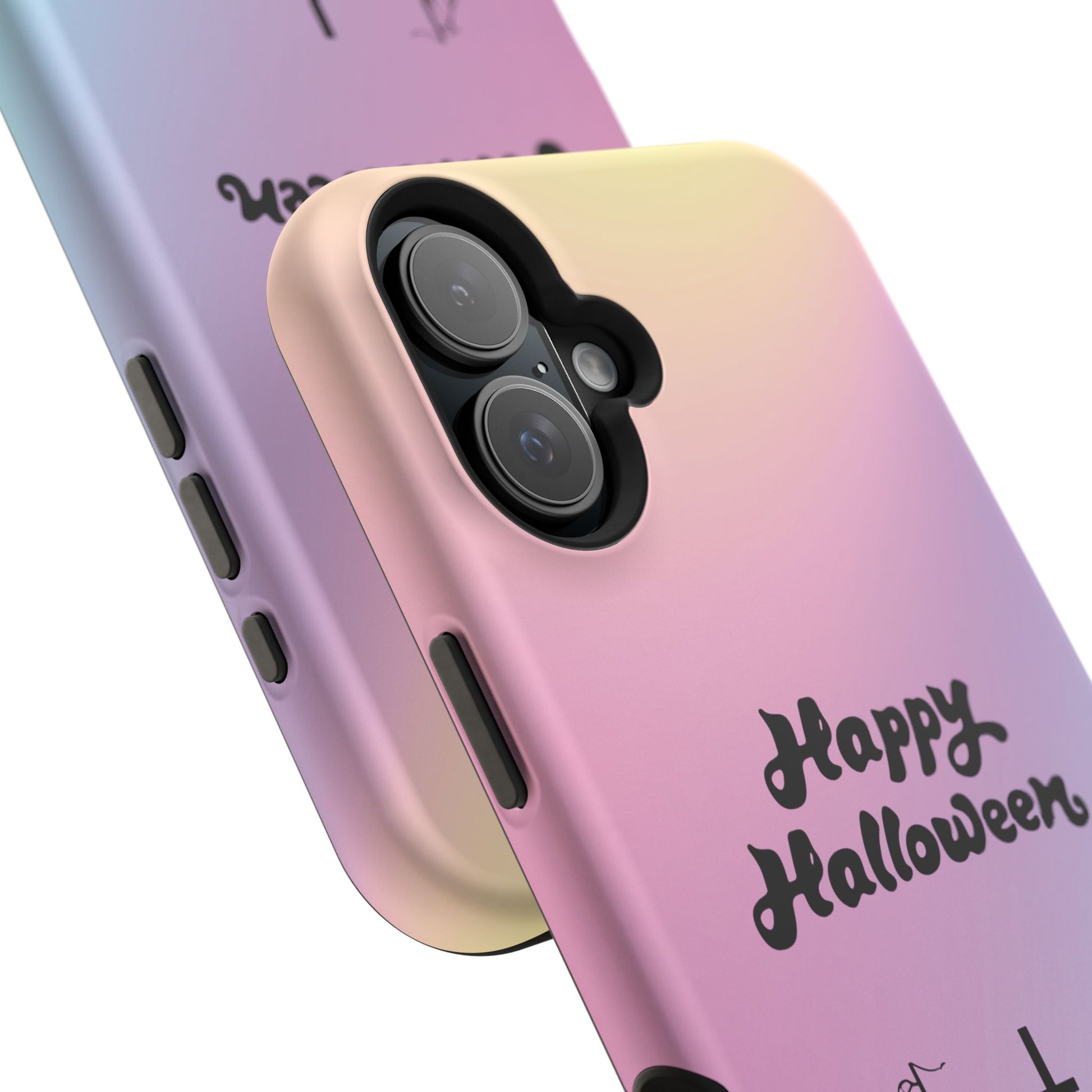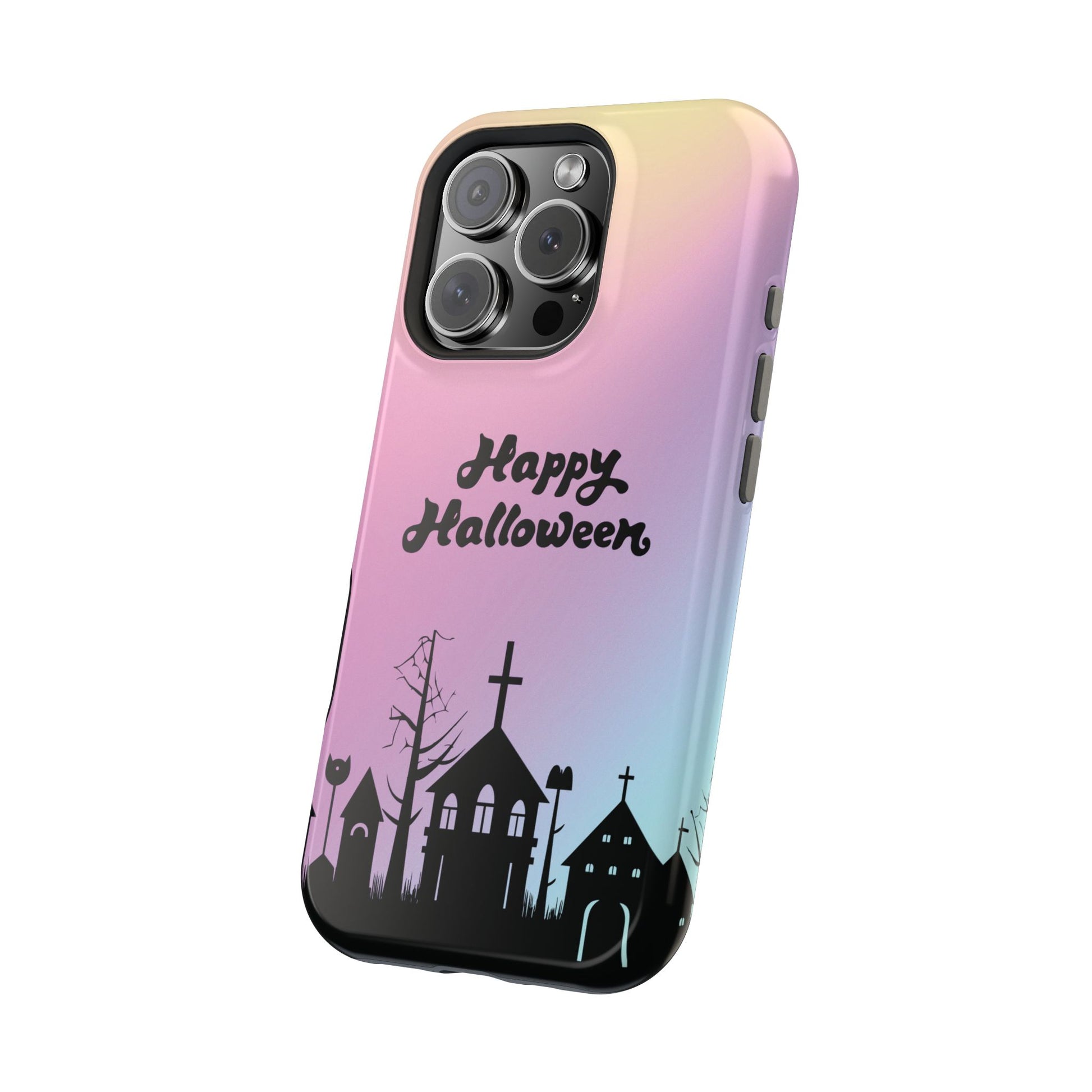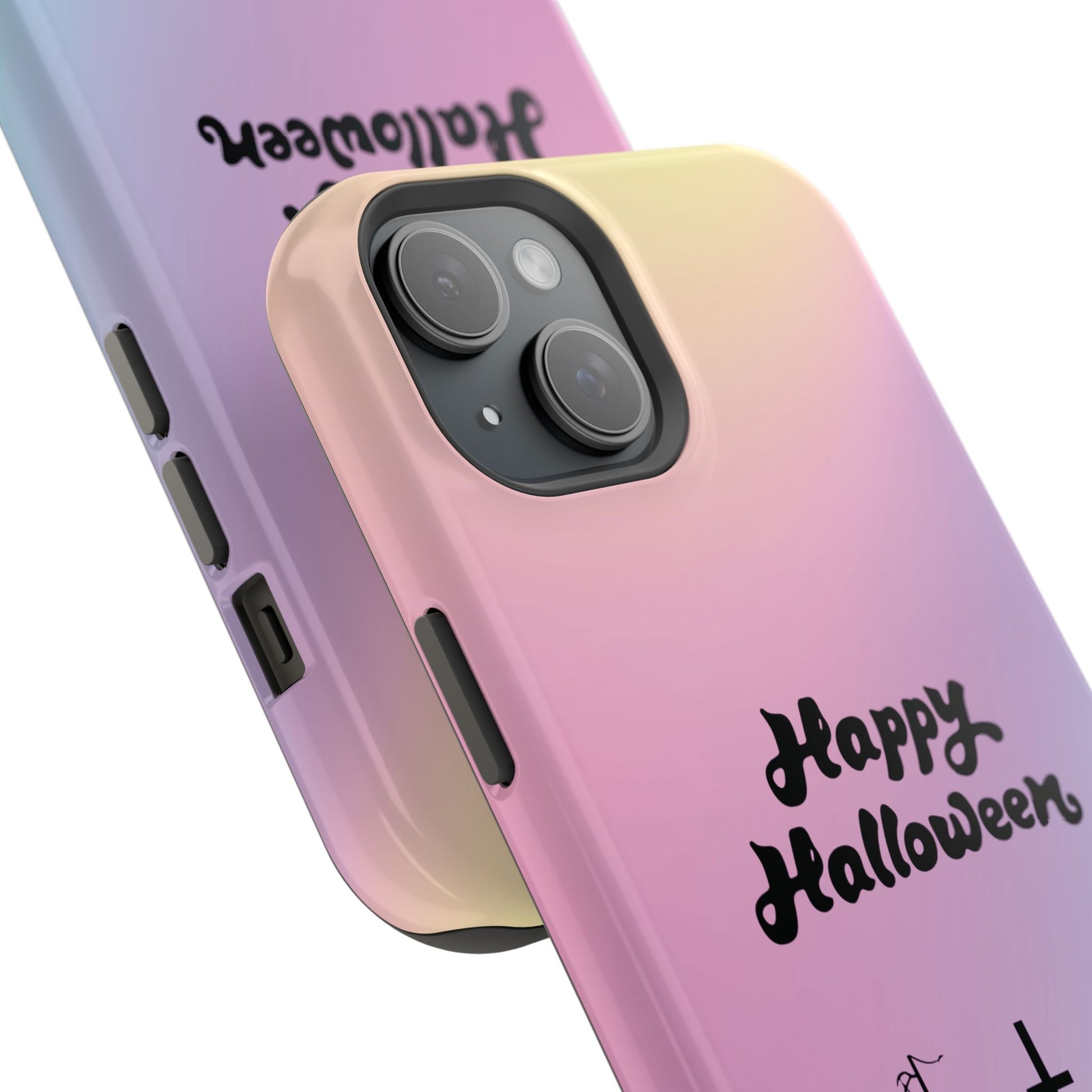 A vibrant and durable phone case featuring a gradient background with a happy Halloween theme and cemeteries. Perfect for Halloween enthusiasts or those who enjoy spooky designs. Ideal for adding a festive touch to your phone during the Halloween season.